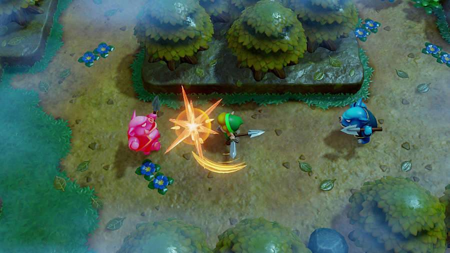 Koholint heißt die Insel jetzt allerdings, da ich das Spiel in englischer Sprache gestartet habe. Das war jedoch zunächst die größte Veränderung, denn ansonsten war ich ziemlich schnell wieder drin. Schiffbruch, Link am Strand, die trällernde Marin und eine sprechende, langsam ins Bild fliegende Eule. Wie Blitze zuckten die Erinnerungen durch meinen Kopf, sogar die Karte hatte ich noch vor Augen. Genau wie viele andere Dinge: Den introvertierten Ulrira habe ich nie vergessen, den kleinen (tödlichen) Shop ebenfalls nicht und natürlich auch nicht das große Tauschgeschäft, das sich wie ein roter Faden durch das gesamte Spiel zieht und euch begleitet. Neu war für mich die viele Farbe, die glänzenden Texturen. Denn Nintendo hat den Klassiker ordentlich aufgebohrt und ihm einen plastischen Look spendiert. Häuser, Bäume, Dungeons und alle Figuren erstrahlen in neuem Glanz. Sieht hervorragend aus. Ein ganz eigener Stil, glatt und sauber. Mir insgesamt ein wenig zu kindlich, aber Link’s Awakening ist auch eher ein niedliches Zelda. Dazu der fein komponierte Soundtrack und allerlei serientypische Geräusche.