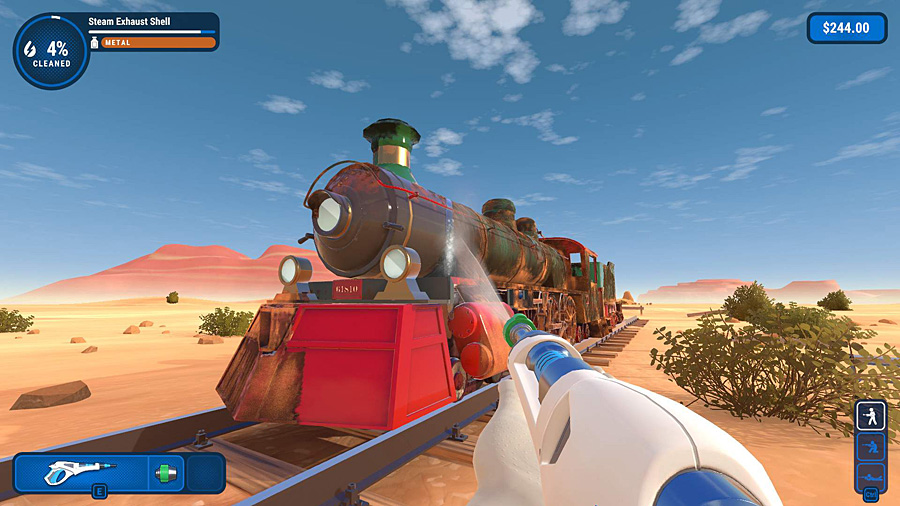 Was mir als Profi an Equipment zur Verfügung steht, muss man sich als Anfänger erst verdienen. Am Ende gehören zu eurer Ausstattung mehrere Geräte und Düsen, Aufsätze und Verlängerungen. Je nach Objekt und Lage der verschmutzen Stelle wechselt man laufend zwischen den Aufsätzen hin und her, nutzt einen konzentrierten Wasserstrahl oder besprüht direkt eine große Fläche. Es wird mit jedem Level und jedem Stück Ausstattung leichter und komfortabler. In fast allen Leveln stehen euch darüber hinaus ein Tritt oder eine Leiter zur Verfügung, ab und an sogar ein Baugerüst, um höhergelegene Stellen zu erreichen. Das alles lässt sich mit einem Tastendruck dort platzieren, wo es gebraucht wird. Obwohl man die Sachen für das verdiente Geld nach und nach einkauft, ist das Ganze absolut nicht komplex oder strategisch und wird schnell zur Nebensache. Wobei ich mich über die rotierende Hochdruck-Spezialdüse, die sich anfühlt wie ein mächtiger Dreizack, tatsächlich gefreut habe wie ein kleines Kind.