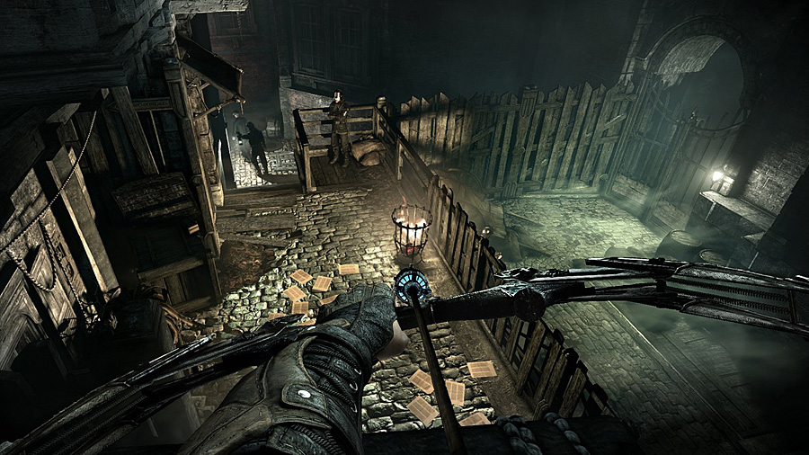 Schleichen muss man mittlerweile in vielen Spielen, bei den wenigsten ist es aber der Hauptbestandteil. Thief ist Mitbegründer des Stealth-Genres und setzt zu 100 % auf besonnenes und gut geplantes Vorgehen. Es ist beeindruckend, dass man das gesamte Spiel ohne Gewalt beenden kann. Wie ein Phantom, völlig unentdeckt. Ihr nutzt die Nacht, den Schatten, lenkt Gegner ab und knackt Schlösser. Die Laufwege der Wachposten werden eingeplant und Dächer erklommen, um unbemerkt von A nach B zu gelangen. Leise bewegt man sich auf das Ziel zu, Tresore, Juwelen, Gemälde und wichtige Dokumente. Laut geht das natürlich auch, allerdings ist Garret im Kampf nicht gerade talentiert, gefährdet so den Erfolg der Mission und zieht die Aufmerksamkeit auf sich. Falls man einen Widersacher wirklich nicht umgehen kann, sollte man zu einem heimlichen Schlag ansetzen, aus der Deckung heraus, und im Anschluss den ohnmächtigen Körper bei Seite schaffen. Die KI der Gegner ist anfangs schwer einzuschätzen, irgendwann hat man den Dreh aber raus. Im Schutze der Dunkelheit wird man selten gesehen, lächerlich wird es dann aber, wenn das Kind bereits in den Brunnen gefallen ist, ihr also enttarnt seid: Hier reicht es beispielsweise aus, in einen Lüftungsschacht zu kriechen. Die Gegner sind dann 30 Sekunden lang völlig aus dem Häuschen, die Musik wirbelt wild – aber niemand kriegt euch zu packen. Und wenig später ist die Welt dann wieder in Ordnung. Der seltene Einsatz des feinen Bogens ist genau diesem Umstand geschuldet. Dabei hat der, den richtigen Pfeil vorausgesetzt, ziemlich imposante Fähigkeiten: Löscht Fackeln, entzündet Ölflecken, schaltet Hunde und Vögel mit Erstickungspfeilen aus, schießt im allergrößten Notfall einem Feind aus weiter Ferne in den Kopf oder nutzt Seilpfeile, um an bestimmten Stellen auf Dächer und Balkone zu gelangen.
