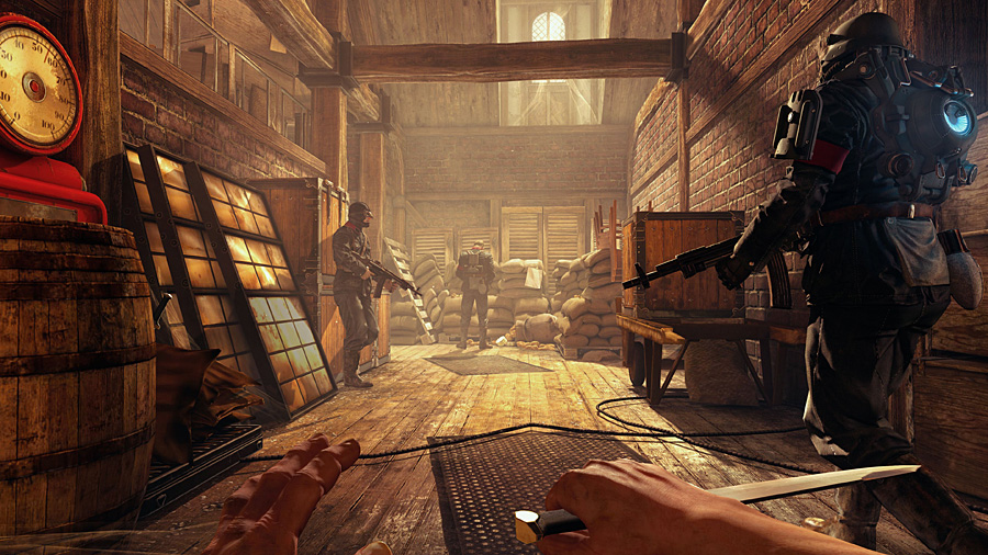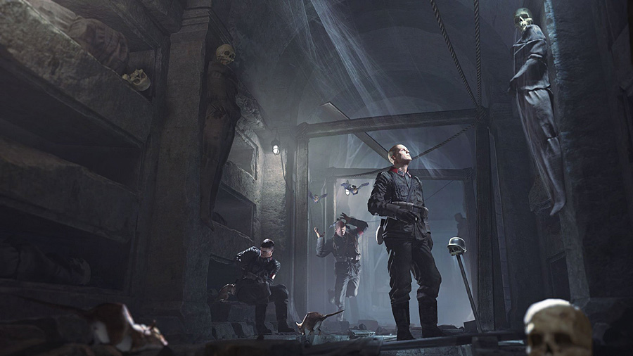 Dabei waren die Vorzeichen so positiv: Die bizarre Atmosphäre und das unglaubliche Design der Serie sind erneut beeindruckend, ab der ersten Spielminute. Hochgradig verfassungsfeindlich prangen Hakenkreuze auf nahezu allem, was ihr entdeckt, das Regime feiert sich selbst auf Werbeplakaten, mit Lobreden und eindrucksvollen Prunkbauten. Es lässt einen erstarren, dann ist man beeindruckt und schließlich lockert MachineGames die angespannte Atmosphäre immer wieder mit bissiger Ironie und schwarzem Humor. Wolfenstein ist ein ungemein kompromissloses und brutales Spiel, nimmt sich aber nicht ganz ernst. Diese einzigartige Stimmung umhüllt den Spieler und Leute wie ich sind doppelt begeistert: Wer Deutsch und Englisch versteht, erfreut sich am bunten Sprachmix und somit an Waffen wie dem Schockhammer oder dem Bombenschuss-Gewehr, über eine Taverne voller Nazis, die deutsches Liedgut trällern, und einen ziemlich amerikanisch wirkenden Protagonisten, der mit gebrochenem Deutsch die Wachposten täuschen will.