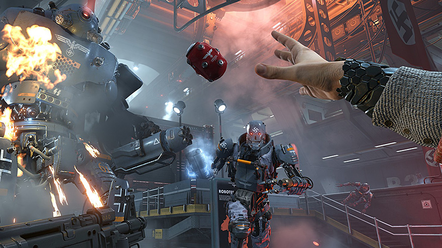 Spielerisch ist MachineGames nicht ganz so kreativ und hat erneut einen geradlinigen Ego-Shooter gebastelt, bei dem ihr als zähe Ein-Mann-Armee in der Haut von B.J. Blazkowicz zahllose Nazis über den Haufen schießt. Zumeist beginnt euer Feldzug jedoch gehockt und leise, im Idealfall pirscht man sich geräuschlos an seine Widersacher heran und erledigt diese effizient und heimlich. Leichen wegschaffen braucht man allerdings nicht, die Nazis sind kaum aus der Ruhe zu bringen. Sie entdecken euch selten und auch tote Kollegen erregen nicht immer direkt deren Aufmerksamkeit. Ist man dann aber doch aufgeflogen bzw. hat keine Lust mehr sich zu verstecken, dreht sich das Spielgeschehen komplett. Der in jedem Areal patrouillierende Kommandant ruft nicht enden wollenden Nachschub und das halbe dritte Reich stürmt in eure Richtung, schwer bewaffnet, treffsicher und deutlich in der Überzahl. Ihr wehrt euch mit Maschinenpistole, Schockhammer oder Laserkraftwerk, nutzt B.J.s außergewöhnliche Nahkampffähigkeiten und zerfetzt einen Widersacher nach dem anderen. Wenn man dann mit einem breiten Grinsen im Gesicht und zwei Sturmgewehren im Anschlag schließlich den Kommandanten erledigt, ebbt der Strom aus Feinden endlich ab.